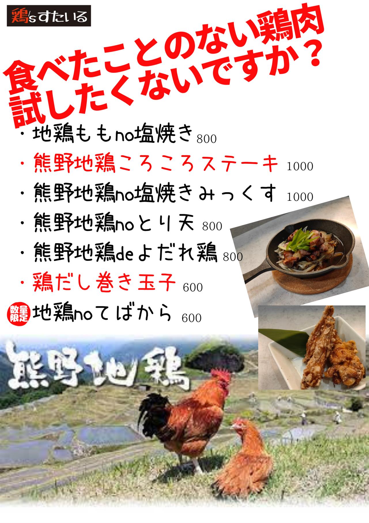四日市市で地鶏を使用した自称絶品鶏料理を提供している居酒屋【鶏'sすたいる】です。近鉄四日市駅から徒歩3分!!走れば2分の場所です!ぜひお越しください!お料理についてもこだわりを持ち、熊野地鶏を中心とした。だわったメニューを丹精込めてご提供しております。家族やご友人、恋人同士など一緒はもちろん、おひとり様でもお気軽にご来店いただけます。四日市市の【鶏'sすたいる】は店舗の貸切りに対応しているため小団体でございますが、ご予約やご利用も可能ですので四日市市の周辺地域で宴会や同窓会などをお考えの方は、ご遠慮なくご相談ください(^^♪そして、より多くのお客様に当店の味をご堪能いただくためにテイクアウトも始めました。お気軽にお問い合わせください!