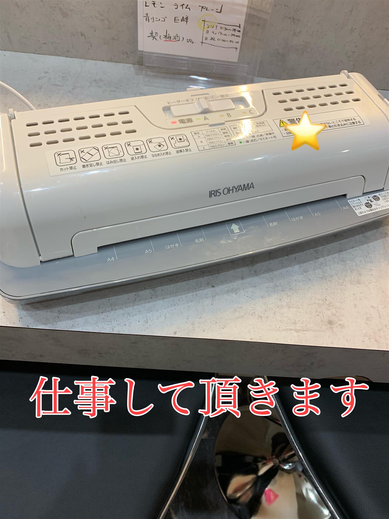 おはこんばんにちは。三重県四日市市の健康な鶏を使ったとり焼肉も美味しい!居酒屋さん。鶏焼肉と鶏料理鶏'sすたいる(ケーズスタイル)のゴリラこと、携帯からコンビニで印刷するのに手間取っていた、ひろぽん。です。やっとこさ、借りて来ました💦ラミネーター。外に写真いるよね!というアドバイスをいただき数枚添付していこうとしております。メニューも色々?加えていきますが…業者との兼ね合いで、土曜日開始となりそうですが……土曜日には、写真付きで添付させて頂きますので、しばしお待ち下さい😆さぁ、ラミネートに悪戦苦闘する鶏焼肉屋さん鶏'sすたいる!開店してます😊#四日市グルメ #四日市居酒屋#四日市ディナー #四日市焼肉#四日市鶏焼肉 #焼肉 #鶏焼肉#角ハイボール #ハイボール#レモンサワー #こだわり酒場#同窓会 #宴会 #新年会#貸切 #貸し切り #四日市飲み#はまぐりチャプターhttps://lin.ee/bsfvGAU